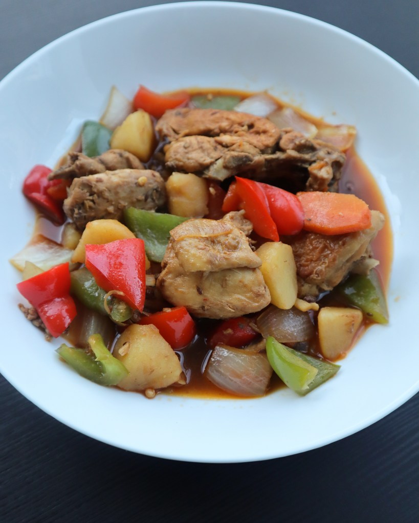 Da Pan Ji is a traditional Dungan dish hailing from the Xinjiang in China. This dish is very popular amongst the Chinese muslim communities and the Uyghurs. This fiery chicken stew gets its signature flavour from dried red chillies and Sichuan peppercorn. Its a great dish to use up all you leftover vegetables.